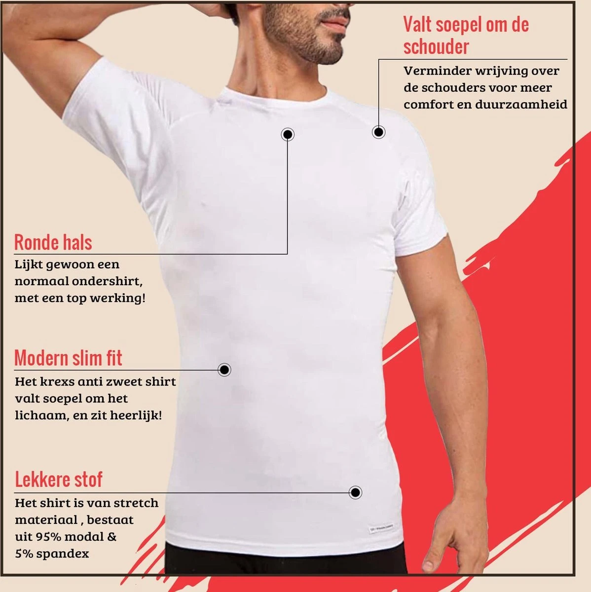 Heb jij last van zweetplekken onder je oksels? Je zit minder lekker in je vel en schaamt je? Met het dragen van het Krexs anti zweet shirt wordt het hebben van zweetplekken onder je armen met 100% gereduceerd! Doordat het Krexs anti zweet shirt is uitgerust met unieke okselpads, zijn gênante zweetplekken verleden tijd, doorlekken waardoor er natte okselplekken te zien zijn in je bovenkleding is onmogelijk. Anti zweet shirts zijn erg fijn als ondershirt, en zijn heel het jaar door te dragen. Het shirt is gemaakt van comfortabel en waterdicht materiaal, een echte aanrader!