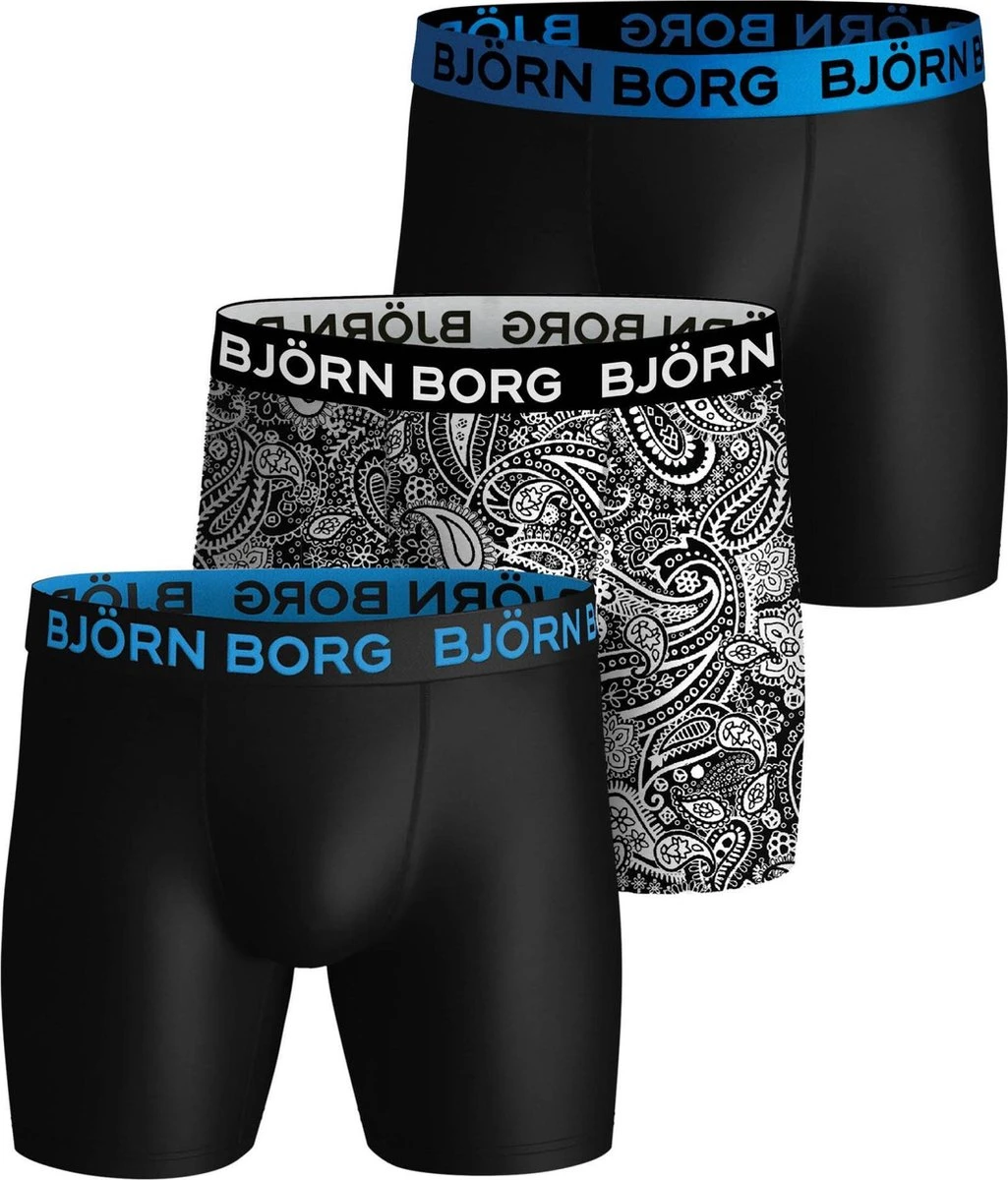 Performance 3-pack print zwart & wit van het merk Björn Borg. Het ondergoed voor heren is gemaakt van polyester.