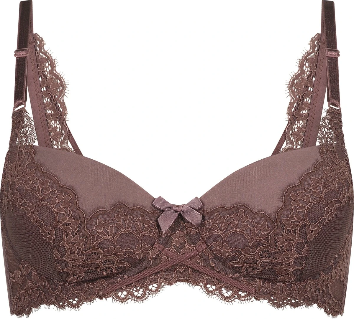 Deze speelse bh is uitgevoerd met kant over de cups. Tussen de cups zitten drie schattige strikjes in een felle kleur.