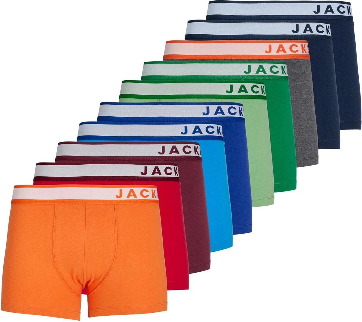 Mega mulitpack van 12 effen kleur Jack and Jones boxershorts. Gemaakt van stretch katoen met elastisch waistband met daarop Jack & Jones branding.