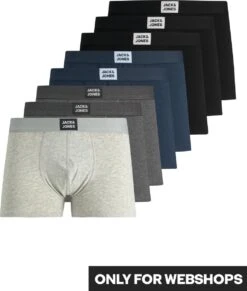 Mulitpack van 8 effen Jack and Jones boxershorts (). Gemaakt van stretch katoen met elastisch waistband met daarop een klein logo aan de voorzijde. 2 donkerblauwe, 3 zwarte, 2 donkergrijze en 1 lichtgrijs.