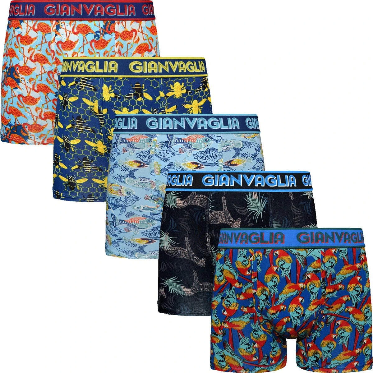 GIANVAGLIA staat voor Italiaans modieus, functioneel en duurzaam ondergoed. Deze set heren ondergoed bevat 5 boxershorts in verschillende leuke prints.