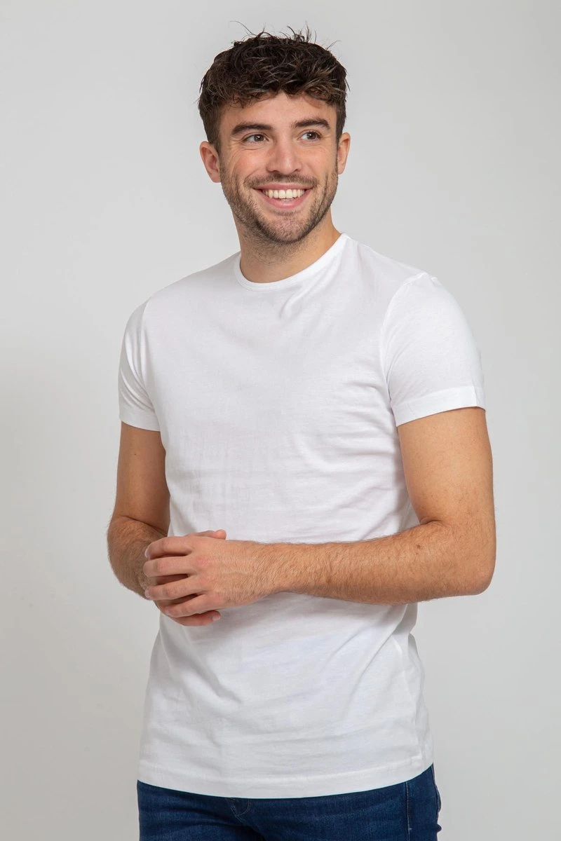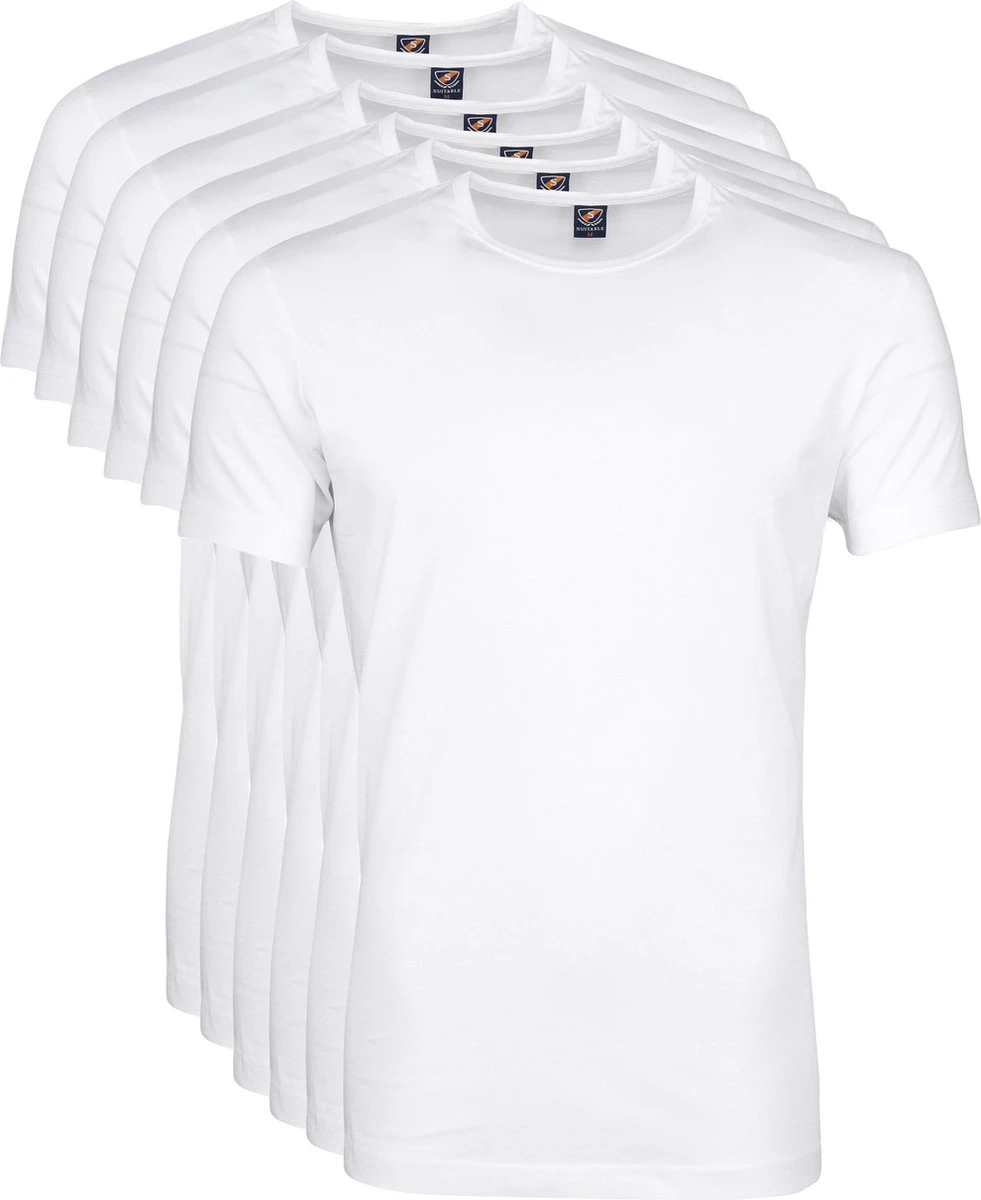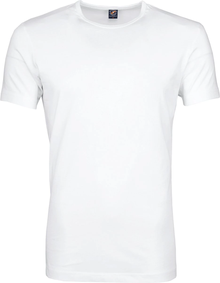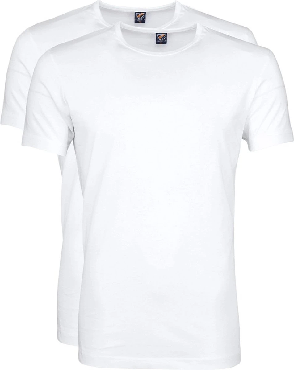 Set van 2 witte, basic T-shirts.Deze witte T-shirts met ronde hals van ons eigen Suitable label zijn de perfecte basis voor je garderobe. Draag de herenshirts bijvoorbeeld onder een overhemd of trui voor extra warmte en comfort. Dankzij de smalle boord en de licht getailleerde Modern-Fit (Tailored-Fit) pasvorm zitten de basic Ota T-shirts erg lekker en kun je ze dagelijks met veel plezier dragen. Luxe kwaliteit biologisch katoen De shirts zitten verpakt in een duoverpakking van 2 stuks en zijn volledig gemaakt van fijn gekamde, biologische katoen. De shirts zijn gemaakt van 150 grams katoen en zijn bewerkt met een Soft Silk Finish, waardoor de stof heerlijk zacht en glad aanvoelt. De korte mouwen zijn voorzien van een gezoomde afwerking. De boord heeft een mooie, smalle boord van 11mm. Set van 2 witte T-shirtsGemaakt van biologisch katoen Licht getailleerde Modern-Fit pasvormBewerkt met een Soft Silk Finish Better Cotton Initiative (BCI) gecertificeerd productWasadvies Was de T-shirts altijd voordat je deze de eerste keer gaat dragen. Er kan tijdens deze eerste wasbeurt overtollige vezelstof vrijkomen. Dit is puur residu en zal de kwaliteit van de T-shirts niet aantasten. Was je witte kledingstukken nooit samen met uw gekleurde kleding. Dit kan zorgen voor verkleuringen. Daarnaast kunnen de witte katoenvezels zich hechten aan gekleurde kleding. Het wordt afgeraden om katoen sneller dan 1400T te laten centrifugeren, om beschadiging van de katoenvezels te voorkomen.